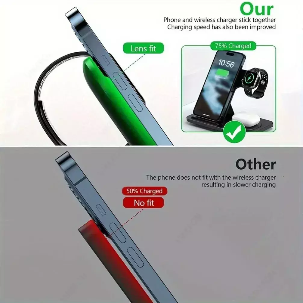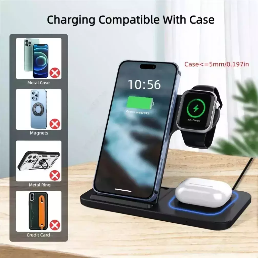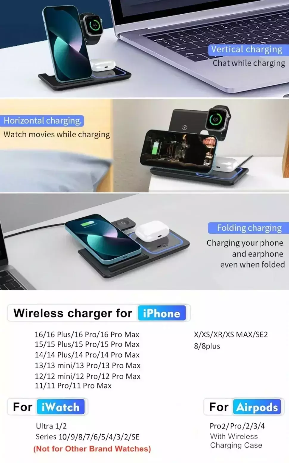 SUPORTE DE CARREGADOR SEM FIO 3 EM 1:estação de carregamento sem fio pode carregar seu Apple iwatch 2/3/4/5/6/SE/7/8/9/10 Ultra?NÃO PODE para Samsung Watch?, Airpods Pro/2/3/4/Pro2, telefones ao mesmo tempo, como para iPhone 16/16 Pro/16 Pro Max/15 Pro/15 Pro Max/14/14/14 Plus/14 Pro Max/13 Pro/13 Pro Max/13 Pro Max/13 Mini/12 Pro Max/12 Pro Max/12 Mini/11 Pro/11 Pro Max/SE/8/8/8/8 plus, Samsung Galaxy S25/S24/S23/S22/S21/S20/S10 séries e todos os dispositivos com certificação Qi.Diga adeus aos cabos bagunçados, deixe sua mesa e mesa de cabeceira organizadas e organizadas.Para uma melhor experiência de carregamento, use o adaptador de energia QC 3.0 (adaptador QC 3.0 não incluído).